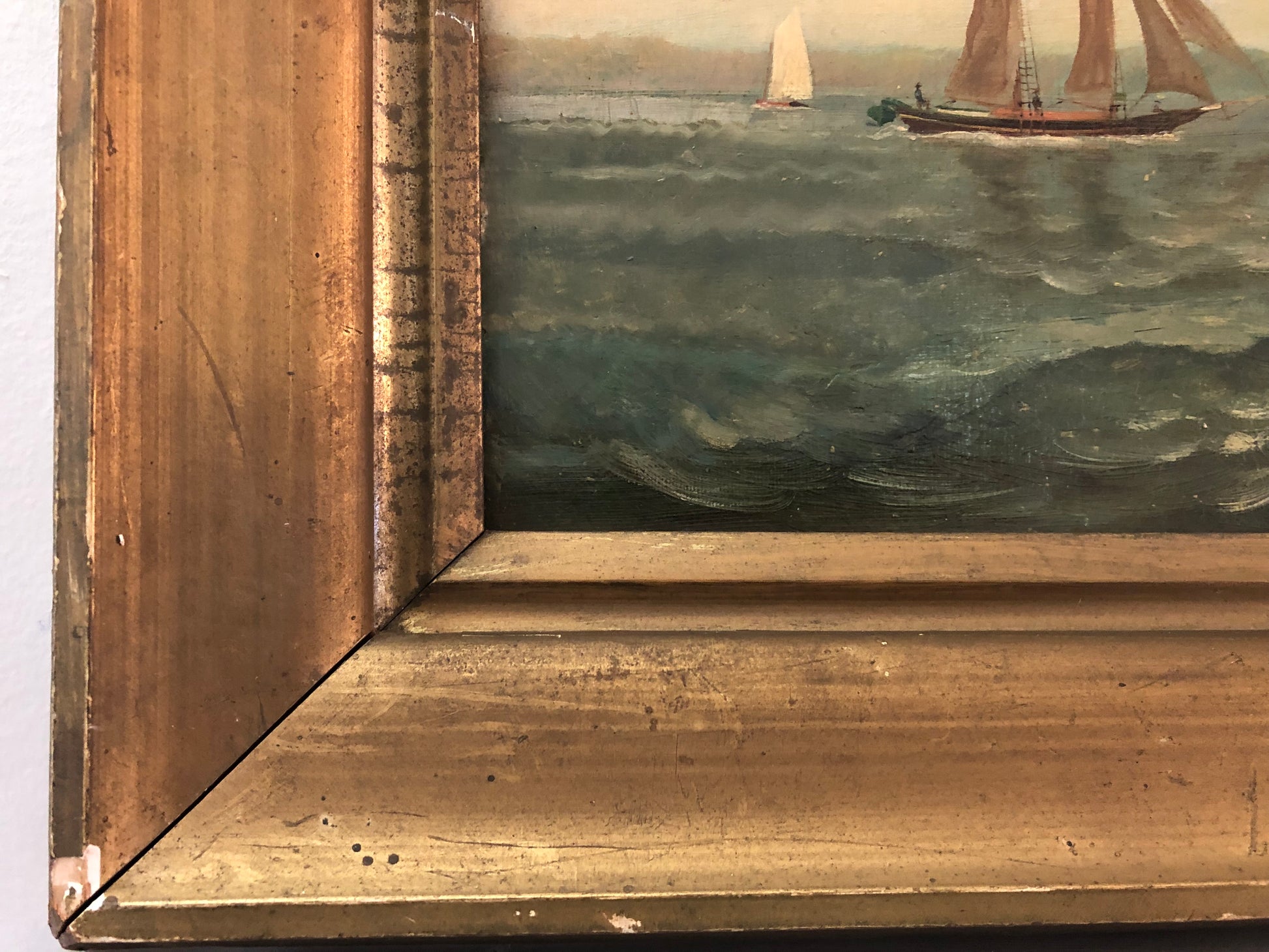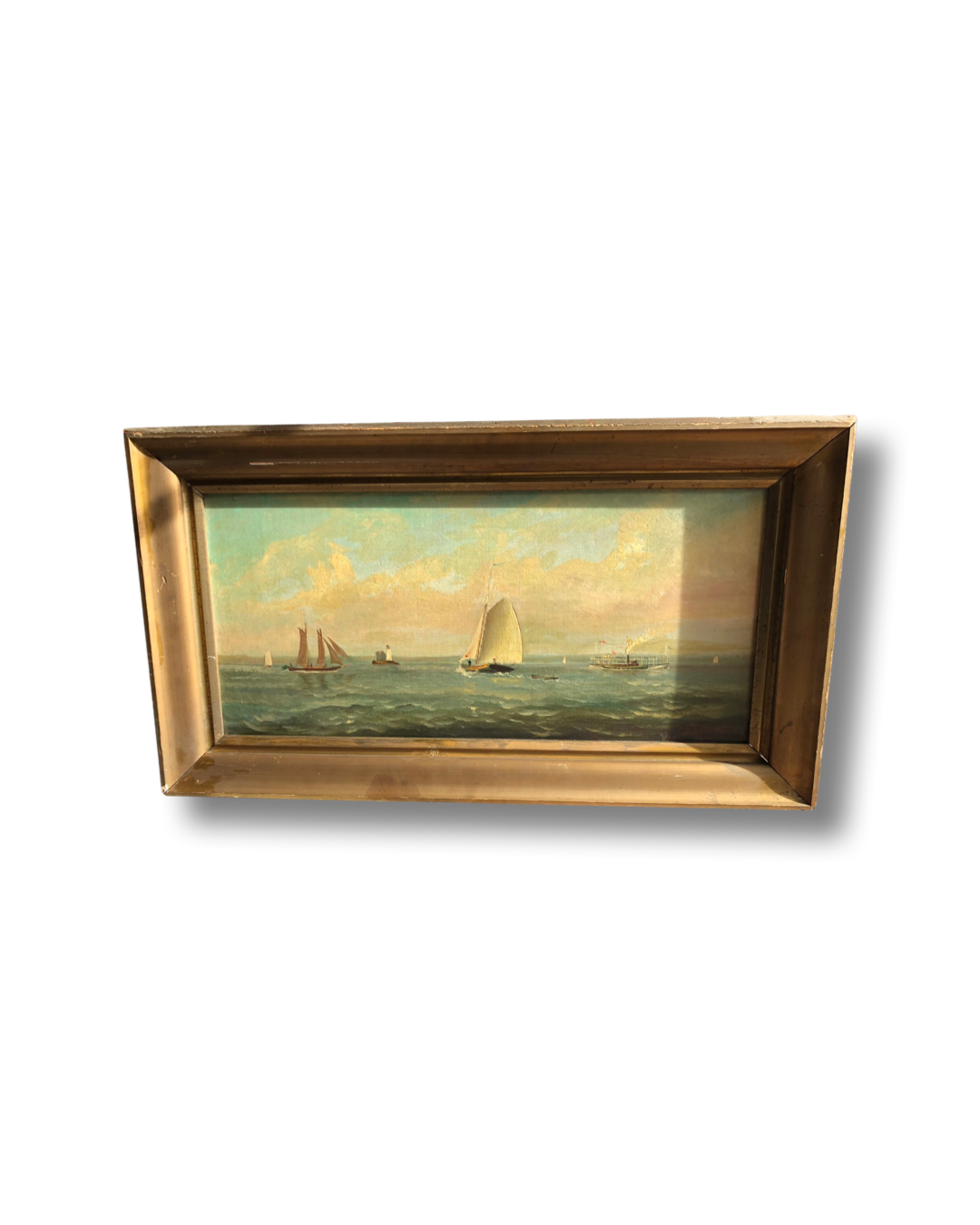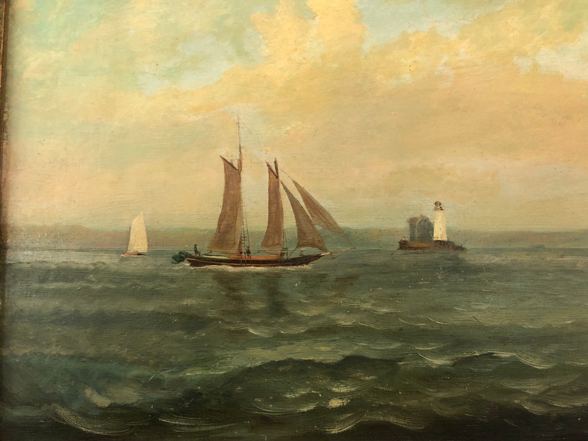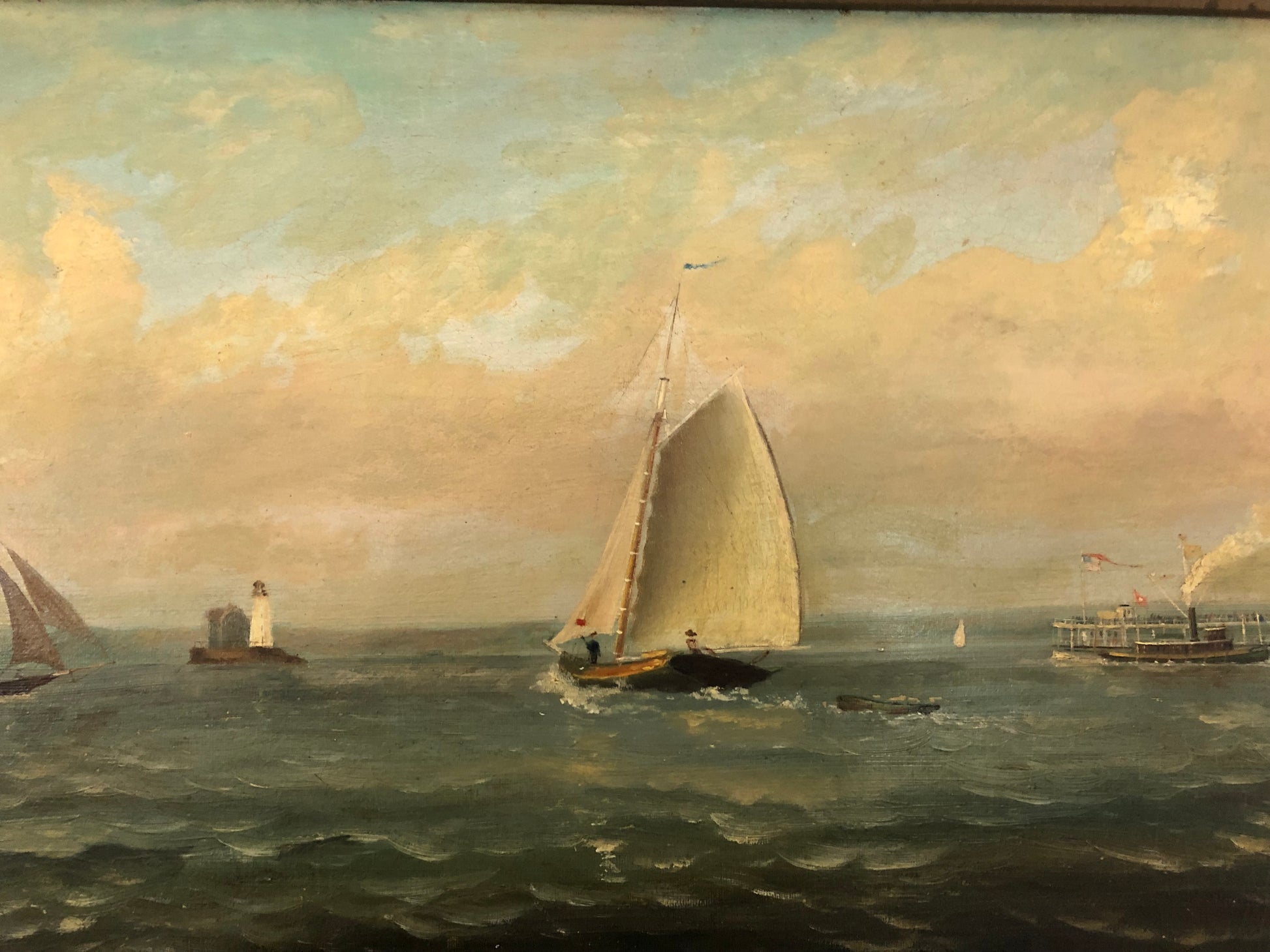 Beautiful nautical original landscape oil painting in the style of the Hudson School depicting sailboats, a lighthouse, and a steam boat with American flag in a harbor. Dated 1885.