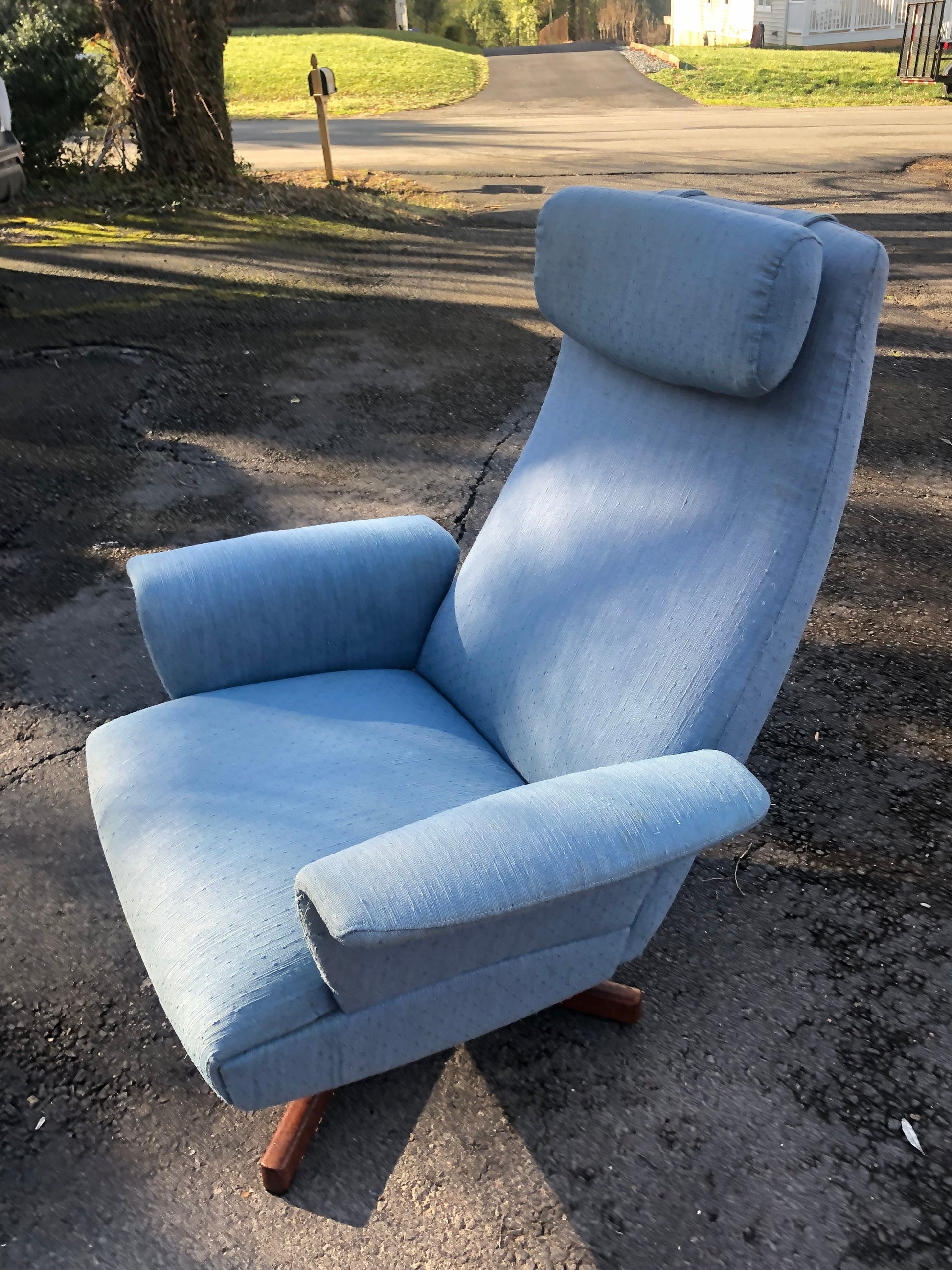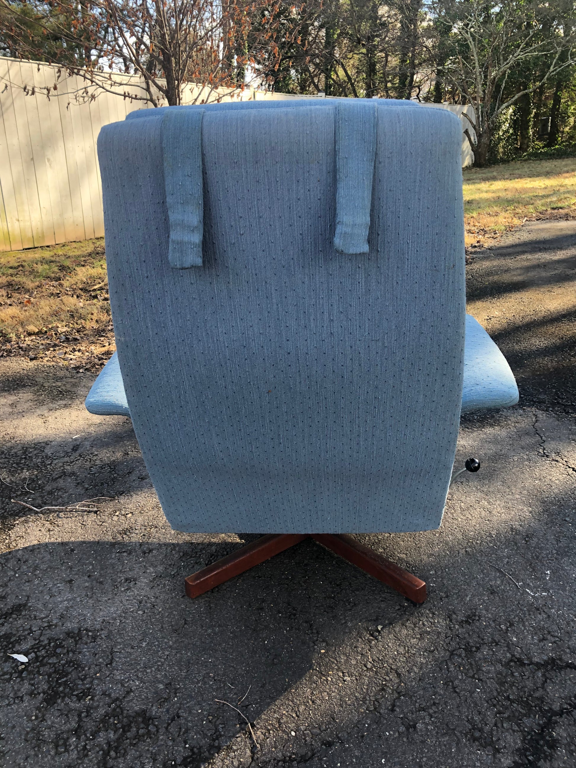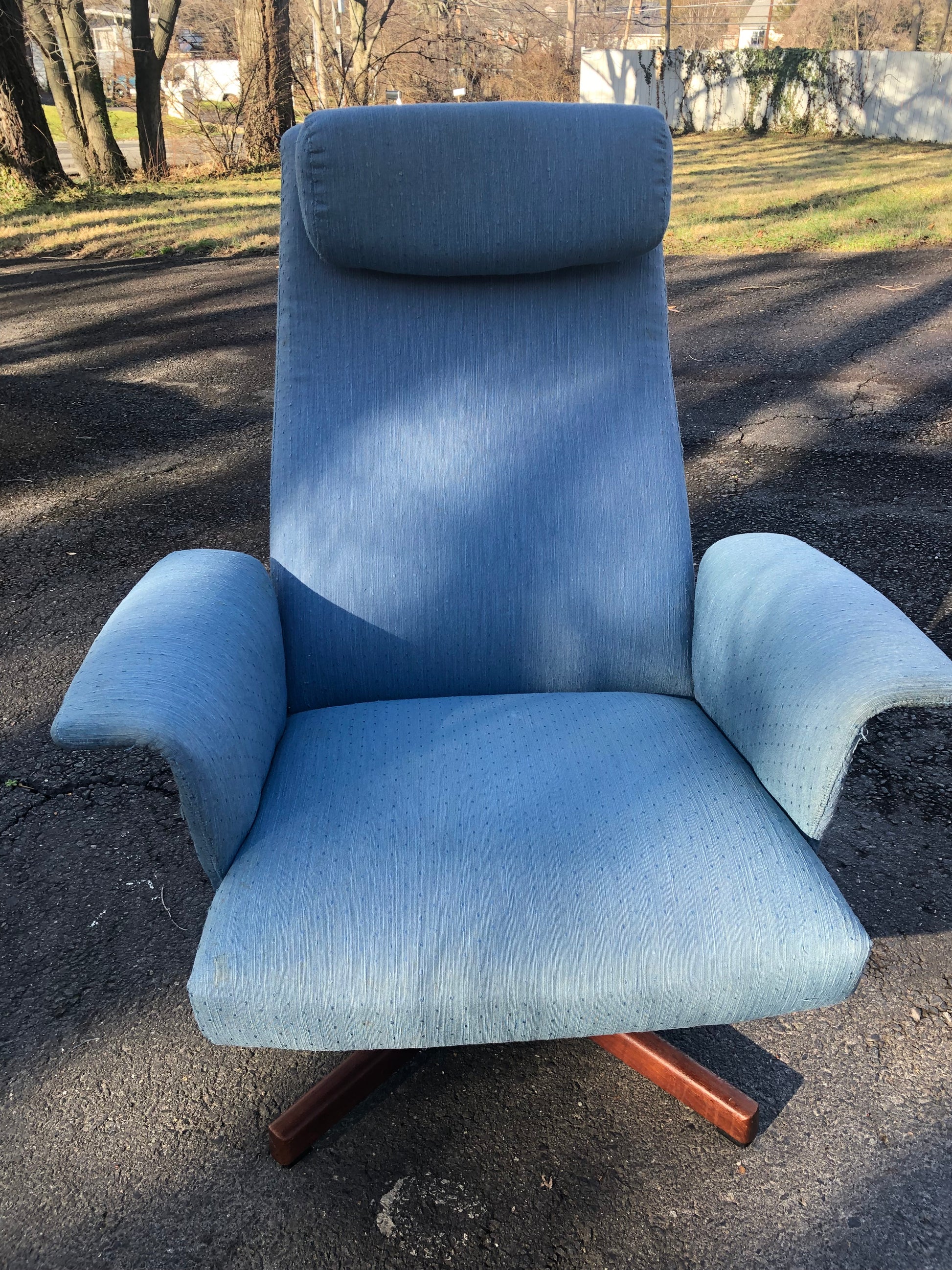 Fabulous original MCM Danish lounge chair with adjustable reclining positions and swivel base. Original fabric in good condition. Back has a head rest pillow.